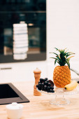 Świeże owoce na desce do krojenia w pobliżu szkła i mikser na stole kuchennym