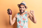 Zdjęcie "Młody Hiszpan trzymający melona uśmiechnięty pomysłem lub pytaniem wskazującym palcem szczęśliwą twarz, numer jeden " może być wykorzystywane do celów osobistych i komercyjnych zgodnie z warunkami zakupionej licencji Royalty-free. Obraz jest dostępny do pobrania w jakości wysokiej rozdzielczości do 5760x3840.