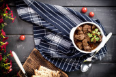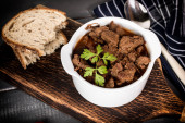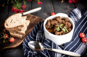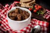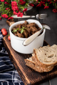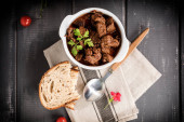 Gulasz z mięsa wołowego w ceramiczny garnek. Widok z góry.