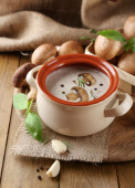 Zupa grzybowa w drewnianą łyżką i puli, drewniany stół, na tle worze