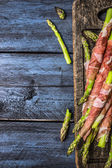 Zielone szparagi owinięte bekonem na drewnianym stole. Widok góry. Przestrzeń kopiowania