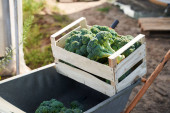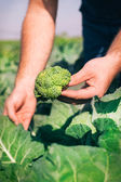 Agronomist gospodarstwa głowa zielonych brokułów na zewnątrz