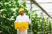 Mężczyzna agronomista pracujący z roślinami w szklarni