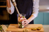 Zdjęcie "Szef kuchni doda kiwi do shake 'a." może być wykorzystywane do celów osobistych i komercyjnych zgodnie z warunkami zakupionej licencji Royalty-free. Obraz jest dostępny do pobrania w jakości wysokiej rozdzielczości do 5760x3840.