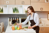 zamyślone niesamowite dziewczyna myślenie o czymś podczas stojąc obok stołu