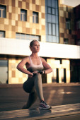 Wyczerpana skoncentrowana silna kobieta w słuchawkach i odzieży fitness odpoczywa i słucha muzyki w słuchawkach na widok miasta na tle. Podświetlone światło słoneczne. Zdrowy styl życia