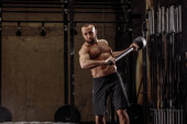 Zamknij zdjęcie widoku ukośnego. brodaty mężczyzna opierający się na młotku