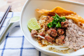 Chiński makaron ryżowy na parze z wieprzowiną, kiełbasą, imitacja paluszka krabowego, kiełki gotowanej fasoli, grzyby i tofu w słodkim sosie sojowym w białej płytce.Chili proszku, marynowane chili i cukru na stole .