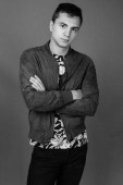 Zdjęcie "Studio strzał młody przystojny nerd człowiek na białym tle w czerni i bieli" może być wykorzystywane do celów osobistych i komercyjnych zgodnie z warunkami zakupionej licencji Royalty-free. Obraz jest dostępny do pobrania w jakości wysokiej rozdzielczości do 5760x3840.