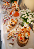 Stolik z jedzeniem serwowany na talerzach podczas uroczystości. Przekąska dla gości