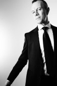 Studio shot przystojnego biznesmena w garniturze na szarym tle w czerni i bieli