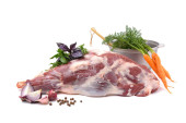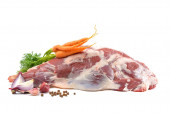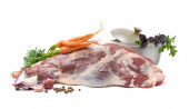 Surowy noga baranina na kość na biały odizolowany tło. Owcze mięso z bliska. Świeży kawałek baraniny. widok poziomy.