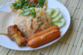 Zdjęcie "Muzułmański żółty ryż z kurczakiem w białym talerzu na drewnianej podłodze" może być wykorzystywane do celów osobistych i komercyjnych zgodnie z warunkami zakupionej licencji Royalty-free. Obraz jest dostępny do pobrania w jakości wysokiej rozdzielczości do 5760x3840.