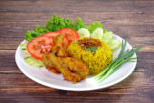 Muzułmański żółty ryż z kurczakiem w białym talerzu na drewnianej podłodze