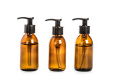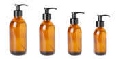Produkty kosmetyczne w butelkach różnej wielkości na białym tle