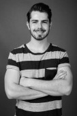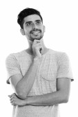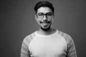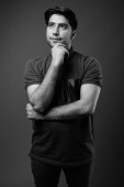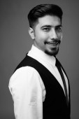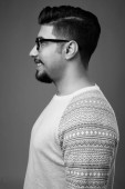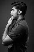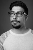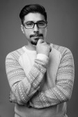 Studio zdjęcia młodego brodatego Irańczyka ubranego w luźne ubrania na szarym tle w czerni i bieli