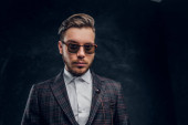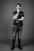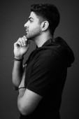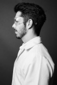 Studio zdjęcia młodego brodatego irańskiego biznesmena na szarym tle w czerni i bieli