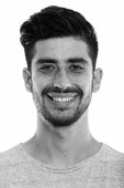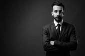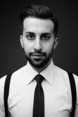 Studio zdjęcia młodego brodatego irańskiego biznesmena na szarym tle w czerni i bieli