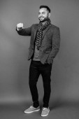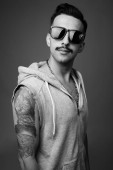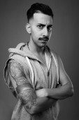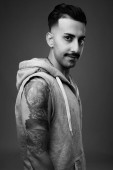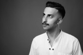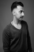 Studio shot młodego przystojnego Irańczyka z wąsami z długim rękawem na szarym tle w czerni i bieli