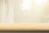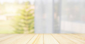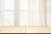 Pusty drewniany blat z rozmytą białą zasłoną i zielonym tłem ogrodowym do wyświetlania szablonu produktu