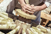 Kamień w starożytnym stroju podczas przetwarzania kamienia z dłuta