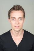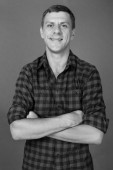 Studio shot młodego hipstera na szarym tle w czerni i bieli