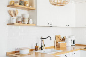 Zdjęcie "Widok na czyste białe proste nowoczesna kuchnia w stylu skandynawskim, szczegóły kuchni, drewniany stół, aster Michaelmas stokrotka bukiet w wazonie na stole" może być wykorzystywane do celów osobistych i komercyjnych zgodnie z warunkami zakupionej licencji Royalty-free. Obraz jest dostępny do pobrania w jakości wysokiej rozdzielczości do 5760x3840.