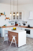 Widok na czyste białe proste nowoczesna kuchnia w stylu skandynawskim, szczegóły kuchni, drewniany stół, aster Michaelmas stokrotka bukiet w wazonie na stole