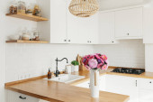 Widok na czyste białe proste nowoczesna kuchnia w stylu skandynawskim, szczegóły kuchni, drewniany stół, aster Michaelmas stokrotka bukiet w wazonie na stole