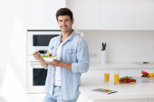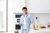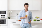 Młody człowiek weganin pijący sok w kuchni. Zdrowy styl życia.