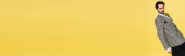 panoramiczne ujęcie człowieka w jesiennym stroju i okulary siedzące na drewnianym stołku na pomarańczowym