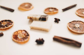 Naturalne mydło cytrusowe na ciemnym tle. Koncepcja Spa, Salon lub Home pielęgnacji ciała i skóry. Leżeć płasko. Miejsce na tekst, widok z góry