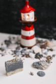 Mała ozdobna latarnia morska z muszlami morskimi i kamieniami na ciemnym tle. Lato, wakacje, pomysł na wakacje. Płaskie ułożenie, widok z góry