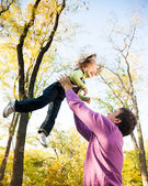 Szczęśliwa rodzina ma zabawy na świeżym powietrzu w jesiennym parku. Matka i dziecko na tle żółtych niewyraźnych liści