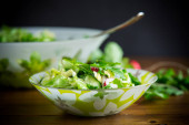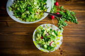 Sałatka wiosenna z wczesnych warzyw, liści sałaty, rzodkiewki i ziół w talerzu na drewnianym stole