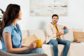 zamarzający mężczyzna w dzianinie sweter, kapelusz i skarpetki trzymając filiżankę ciepłego napoju w kuchni