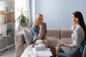 brunetka kobieta z filiżanką kawy siedzi na kanapie w kuchni w pobliżu chłopaka za pomocą laptopa