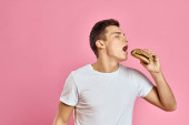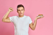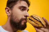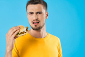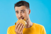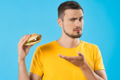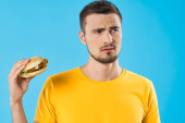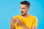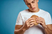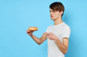człowiek z hamburgerem i białą koszulką niebieskie tło emocje gestykulujące dłońmi Kopiuj przestrzeń