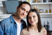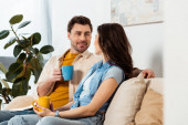 selektywne skupienie radosnej pary odwracając wzrok trzymając filiżanki kawy w kuchni