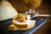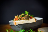gotowanego kawioru bakłażana z przyprawami i chlebem na drewnianym stole