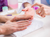 Kosmetyk lub manikiurzysta w specjalnych rękawiczkach medycznych powoduje krem na ręce kobiet.