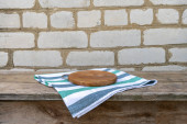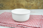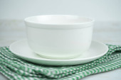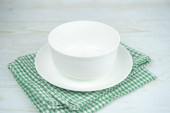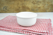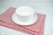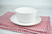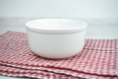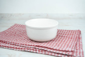 Biała pusta ceramiczna miska na czerwonym ręczniku kuchennym.