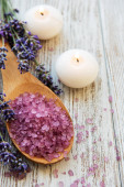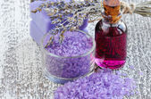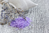 sól do kąpieli Aromaterapia i suszonej lawendy na stary stół z drewna