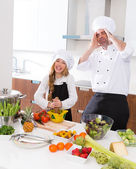 szef kuchni uczeń mistrza i mniejsze dziecko dziewczynka w szkole gotowania