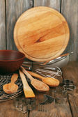 Pusty czarny talerz z łyżką i widelcem umieszczony na starym czarnym drewnianym stole z wolnym miejscem do pisania - widok z góry.