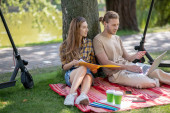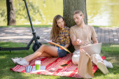 Zdjęcie "Młoda para je lunch w parku i wygląda spokojnie" może być wykorzystywane do celów osobistych i komercyjnych zgodnie z warunkami zakupionej licencji Royalty-free. Obraz jest dostępny do pobrania w jakości wysokiej rozdzielczości do 5760x3840.