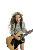 dziewczyna blond rock and roll z gitara basowa na czerwono
