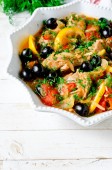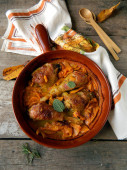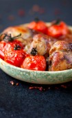 Nogi kurczaka pieczone z pomidorami i czosnkiem w naczyniu do pieczenia na szarym tle