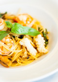 Pikantne spaghetti z krewetkami, małżem i kałamarnicą w sosie pomidorowym zbliżenie na białym talerzu. Zdrowy pyszny lunch, poziomy widok z góry, płaski leżak.