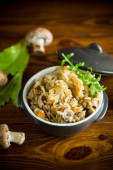 wegetariański gotowany ryż z grzybami w ceramicznej misce na stole